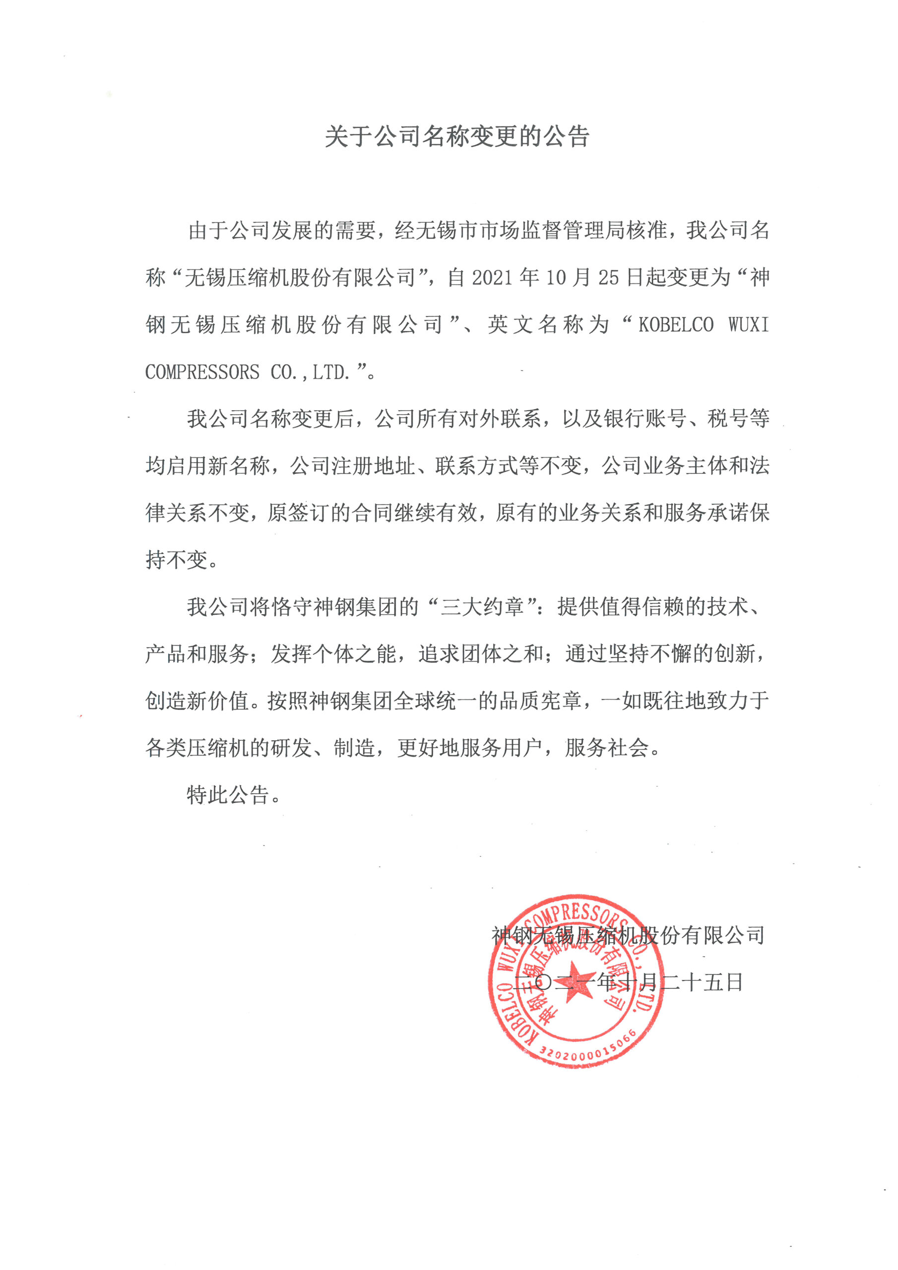 由于公司發(fā)展的需要,經無錫市市場監(jiān)督管理局核準,我公司名稱“無錫壓縮機股份有限公司”,自2021年10月25日起變更為“神鋼無錫壓縮機股份有限公司”、英文名稱為“KOBELCO WUXI COMPRESSORS CO.,LTD.”。