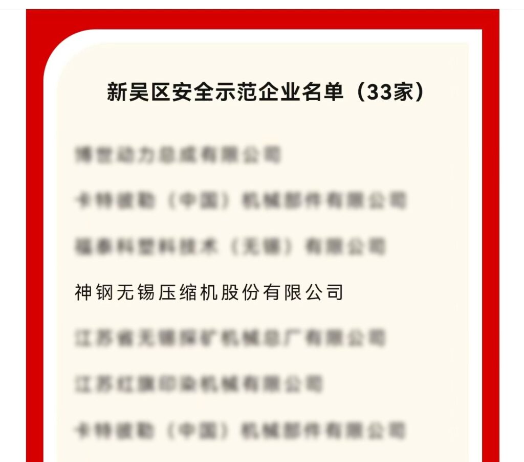 近日,無錫市新吳區(qū)應(yīng)急管理局組織開展了全區(qū)安全生產(chǎn)示范企業(yè)評選認(rèn)定工作,經(jīng)企業(yè)自愿申報、各主管街道應(yīng)急管理部門推薦、現(xiàn)場審查、評委會討論、公示等程序,神鋼無錫壓縮機股份有限公司榜上有名,獲評“安全示范企業(yè)”。